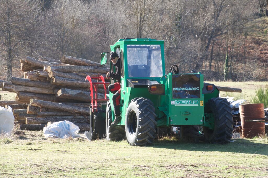 Le tri, la reprise et le transport interne des grumes sont pris en charge sur site. Ils s’appuient notamment sur un Massey Ferguson 6180 (120 ch) associé à une remorque forestière Agriduarte 12 t avec grue 7 m, ainsi que sur un télescopique Merlo 25.9 muni d’une fourche et d’une pince. Cet ensemble permet un tri précis, une manutention sécurisée et un acheminement maîtrisé des bois entre zones de coupe, dépôts et espaces de transformation.