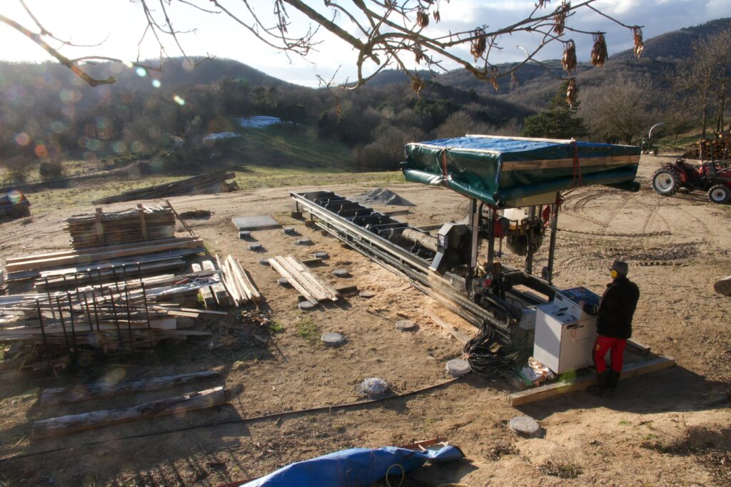 Sciage à la demande à partir de nos grumes issues du Haut Vallespir. Châtaignier, pins, feuillus ponctuels — transformés sur site avec une scie fixe à ruban professionnelle.